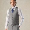 The Torlesse Morning Waistcoat Grey Sharkskin tailored from exquisite grey sharkskin fabric, features a double breasted design with six buttons and two slanted welt pockets, ensuring both style and functionality. The back and martingale lining add an extra layer of sophistication, highlighting the meticulous craftsmanship synonymous with Gieves and Hawkes. Whether paired with a matching suit or worn as a contrasting piece, the Torlesse Waistcoat stands as a testament to timeless British tailoring.