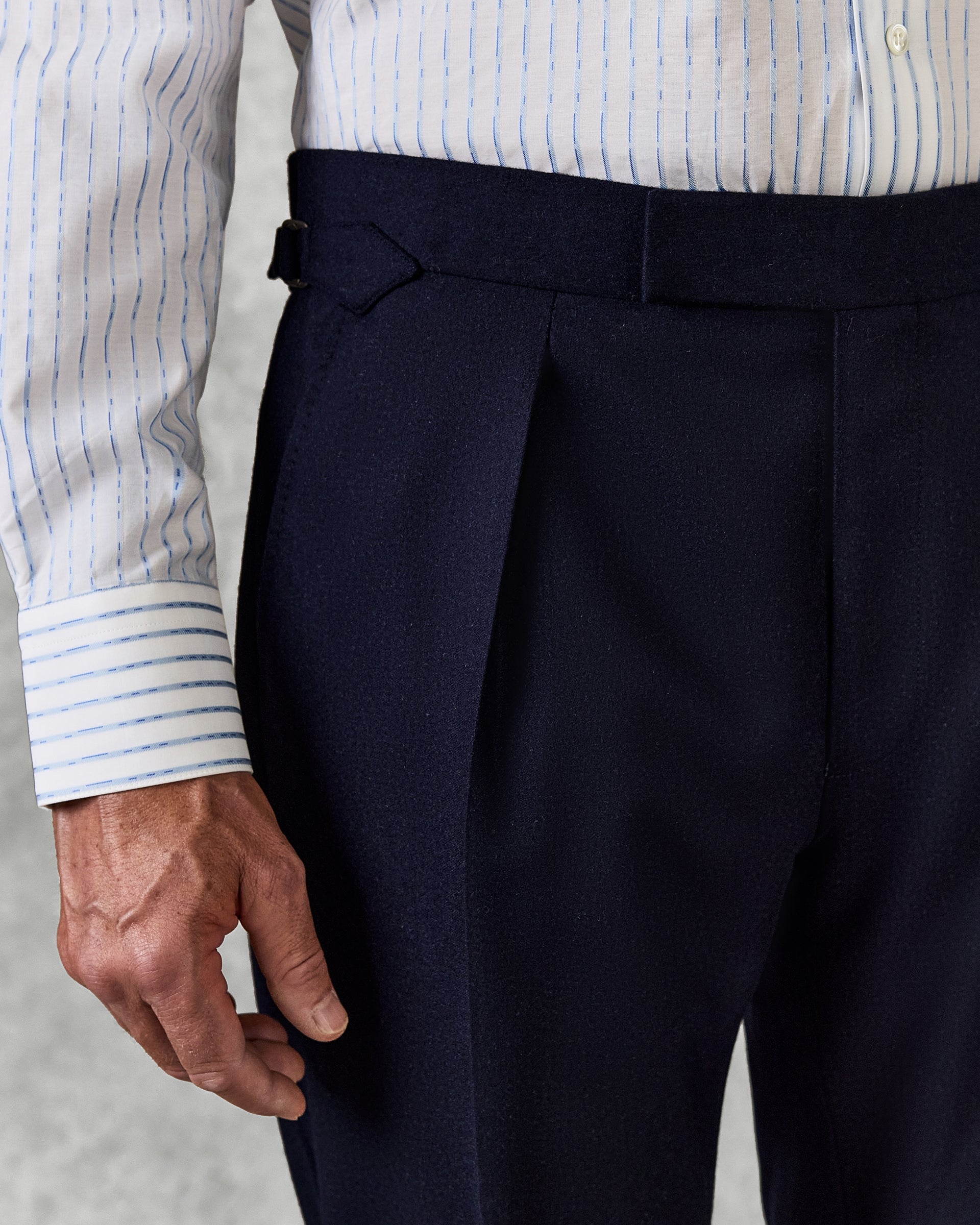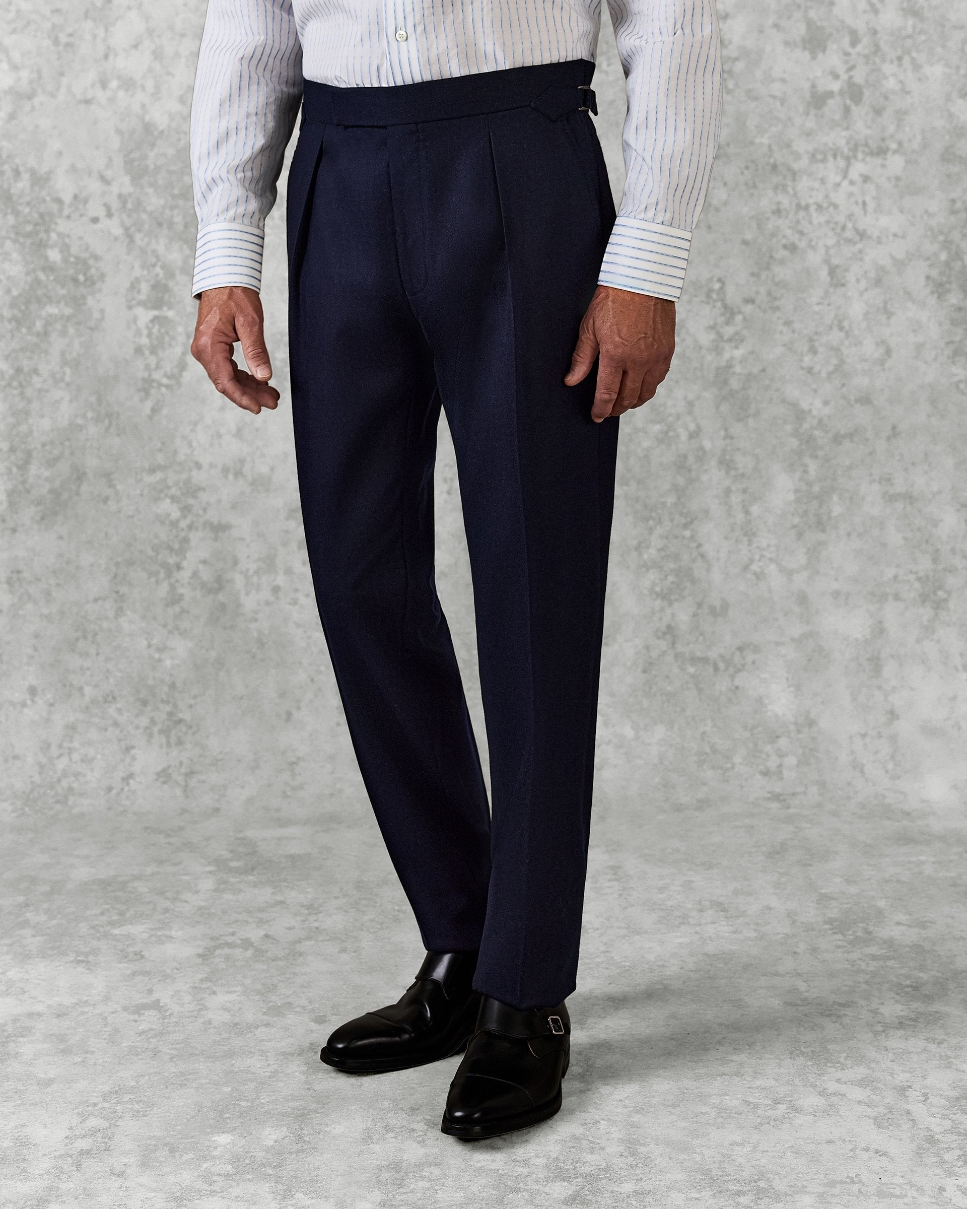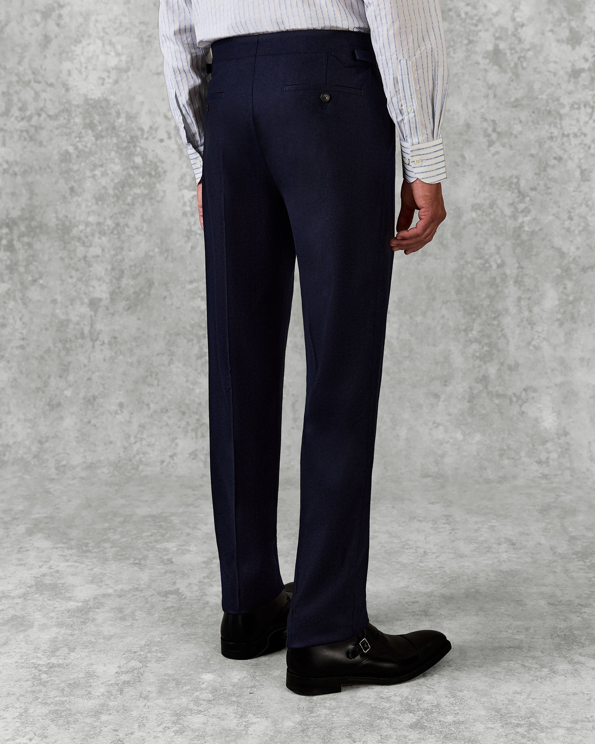 The Cartwright Suit Trouser crafted from premium navy flannel, these trousers are designed with the discerning gentleman in mind. The single pleat front, coupled with elegant side adjuster and slanted pockets with AMF stitching, showcases a meticulous attention to detail. Enhanced by two welt pockets with horn buttons, these trousers offer both functionality and a touch of sophistication. The half-lined construction ensures comfort, while the unfinished hem allows for a custom fit.