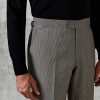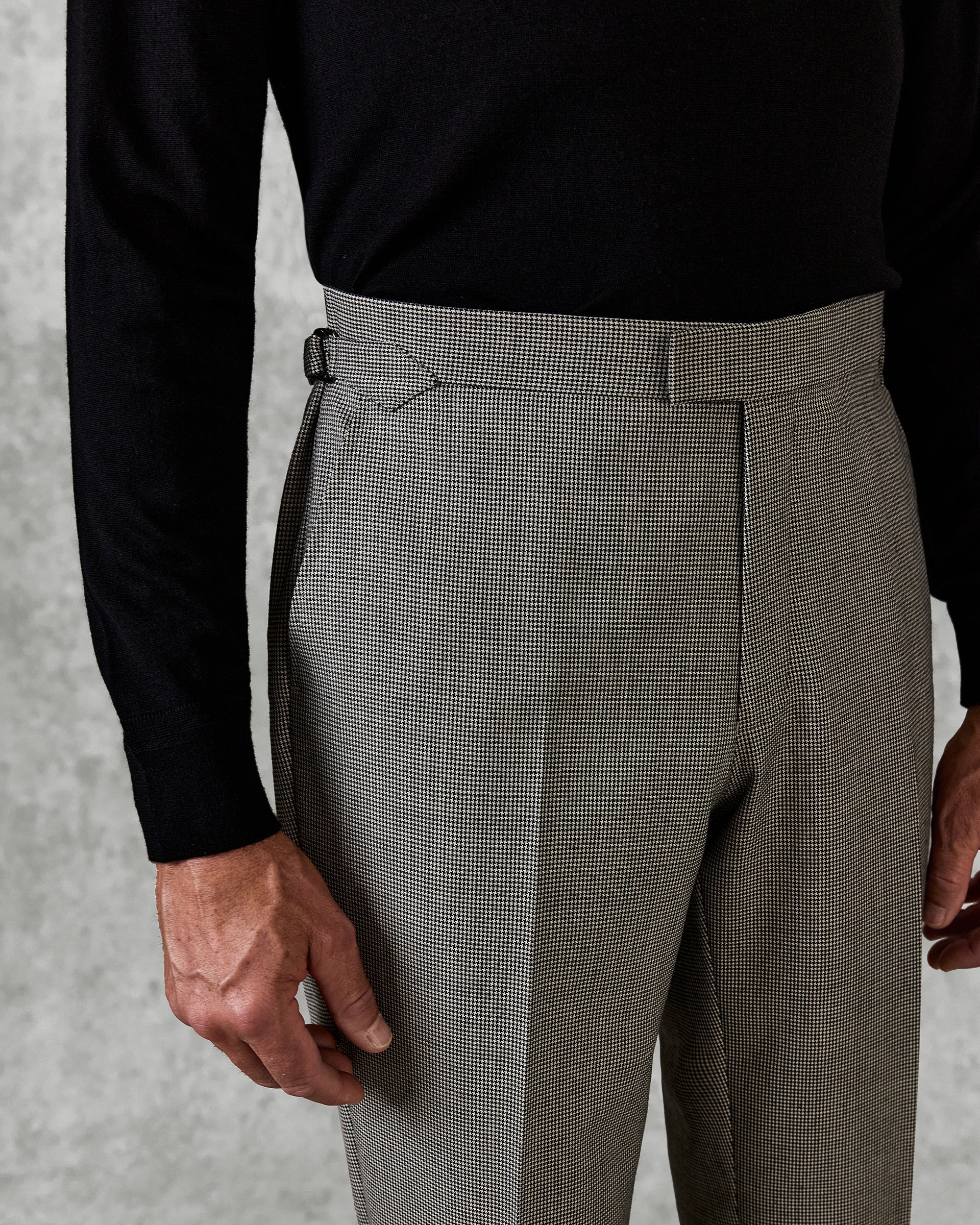 The Fyler Trouser in an exquisite puppytooth, suitable for any distinguished gentleman’s wardrobe. Designed with a flat front and featuring side adjustors with a dinner split. The precise hook closure, two welt pockets with buttons along with slanted pockets detailed with AMF stitching along the pocket, speaks volumes of Gieves and Hawkes craftsmanship.