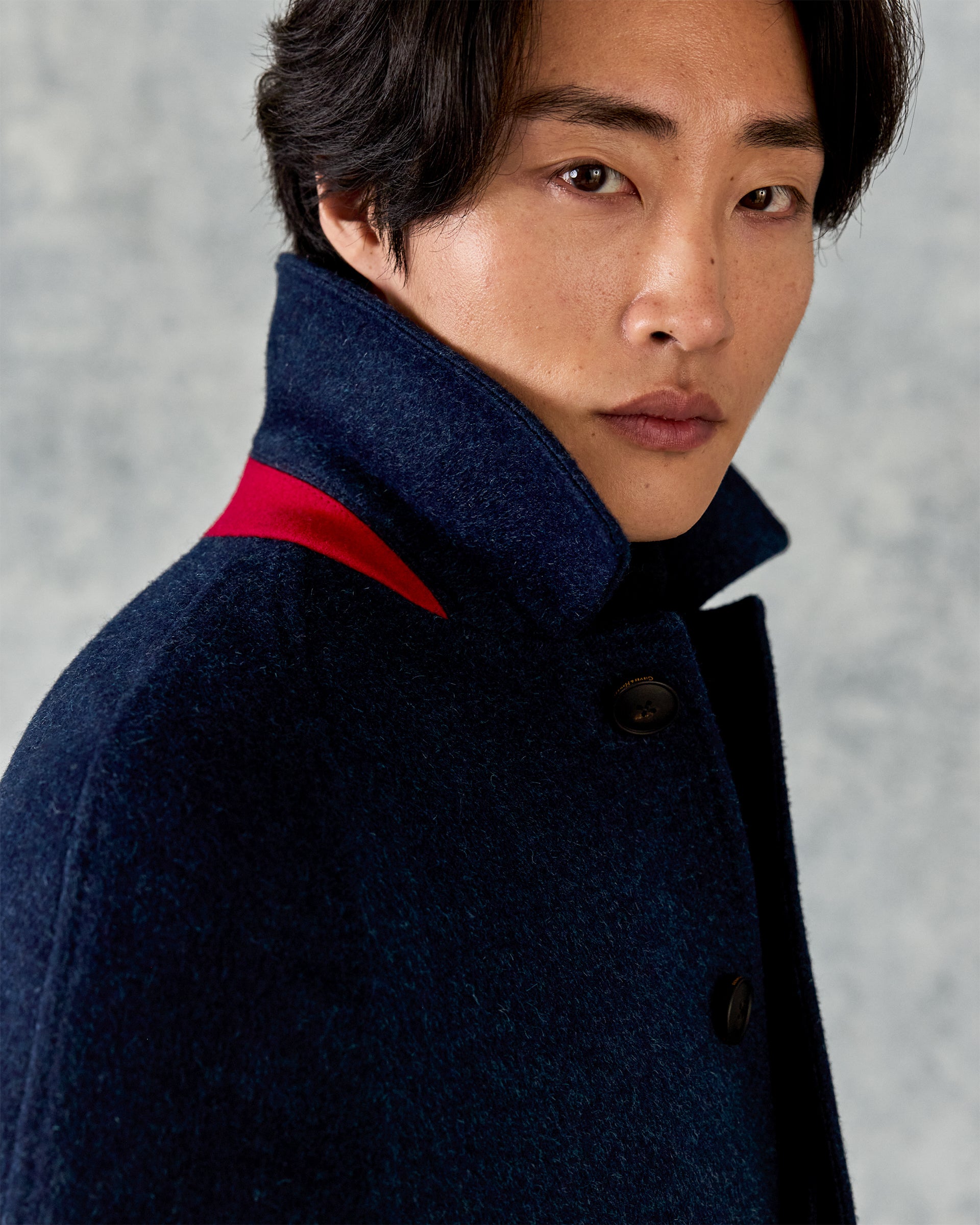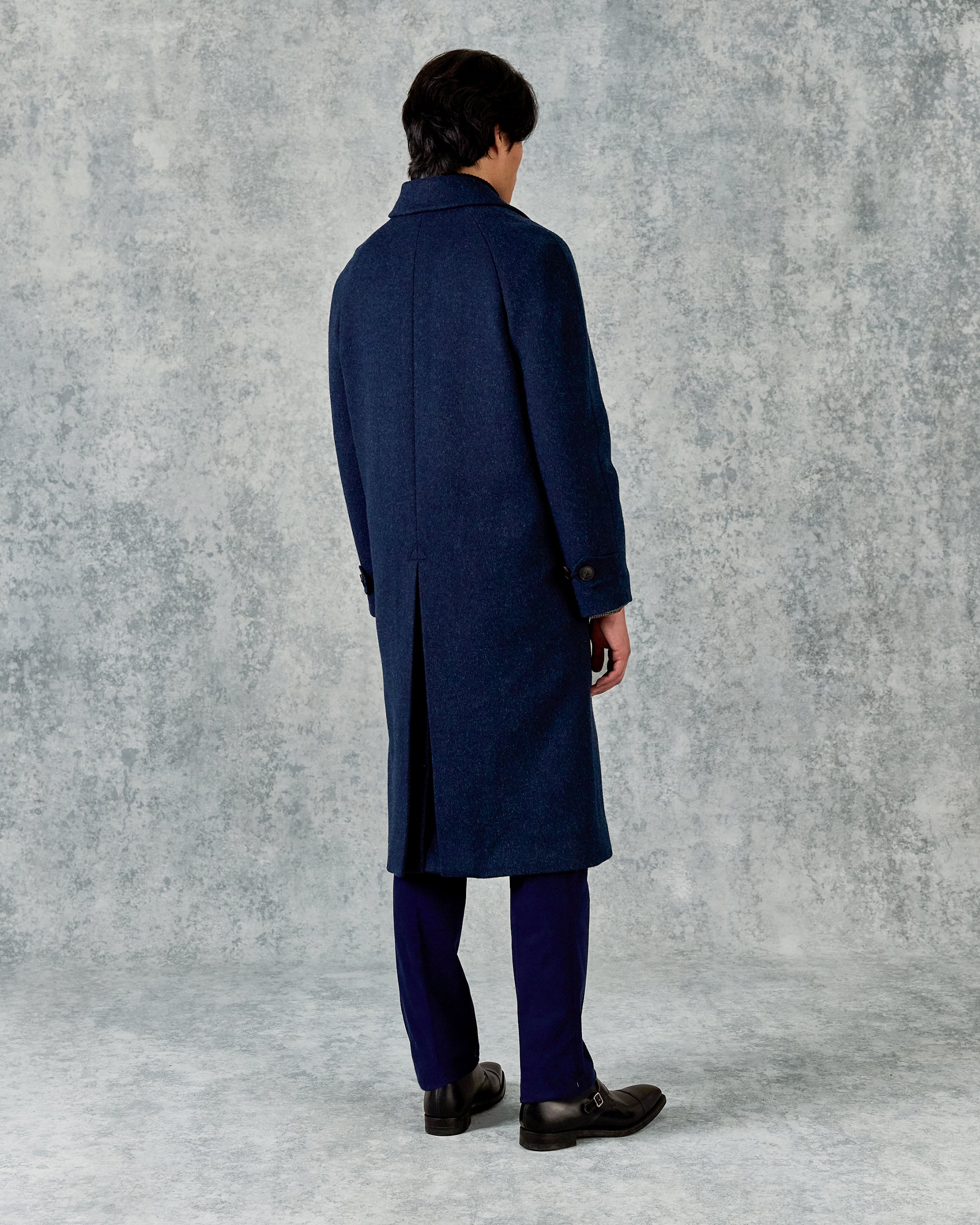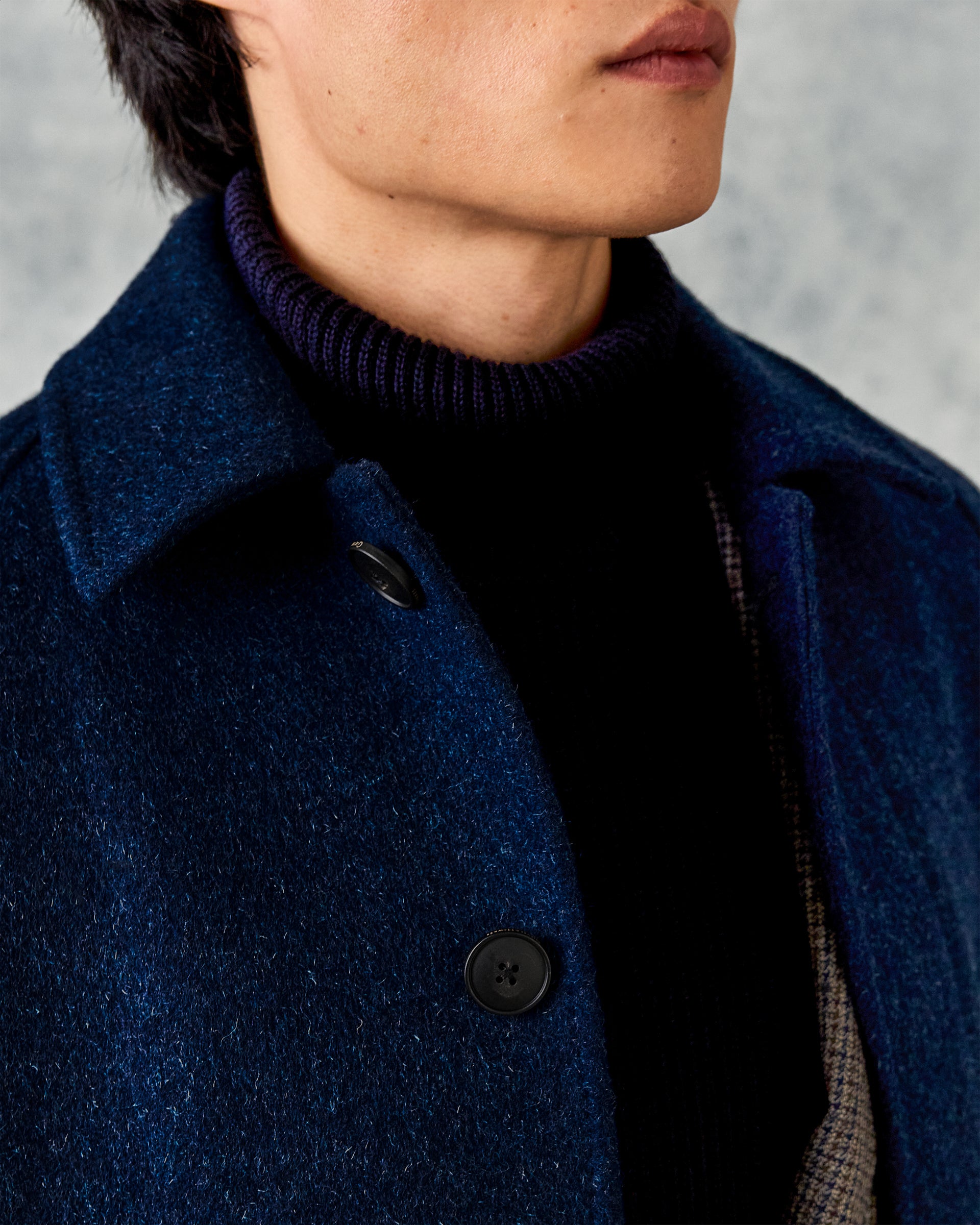 The Harry Wool & Mohair Blue Raglan Coat blends 90% wool with 10% mohair for a rich, structured drape and luxurious warmth. With its refined raglan sleeves, blind fly front, and dark horn buttons, it’s a masterclass in understated elegance.