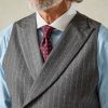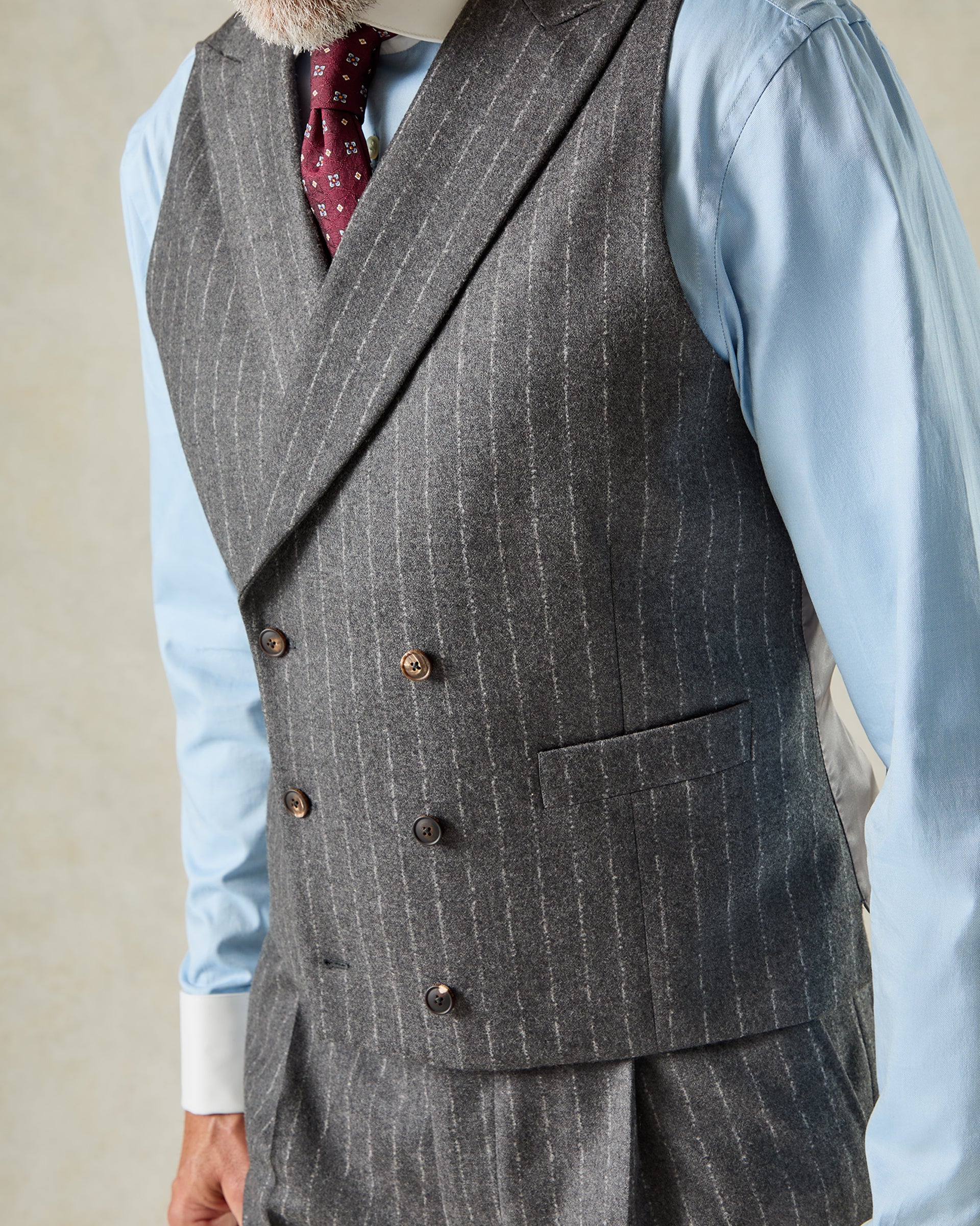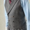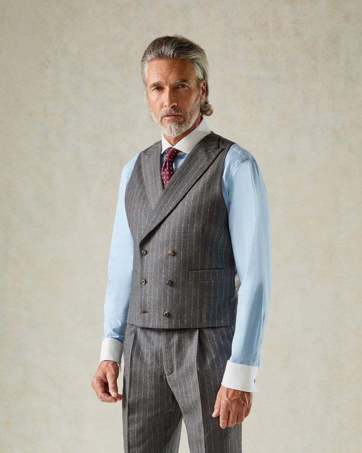 The Markham Suit Waistcoat in Grey Stripe exemplifies unparalleled craftsmanship and sophisticated elegance. This double-breasted waistcoat features six refined horn buttons, accentuating its classic construction and delivering a timeless piece for the discerning gentleman. The formality of the grey stripe pattern is elevated by a unique Morse code stitch design, subtly woven into the fabric, adding an element of intrigue to its impeccably polished look—ideal for any high-profile occasion.