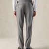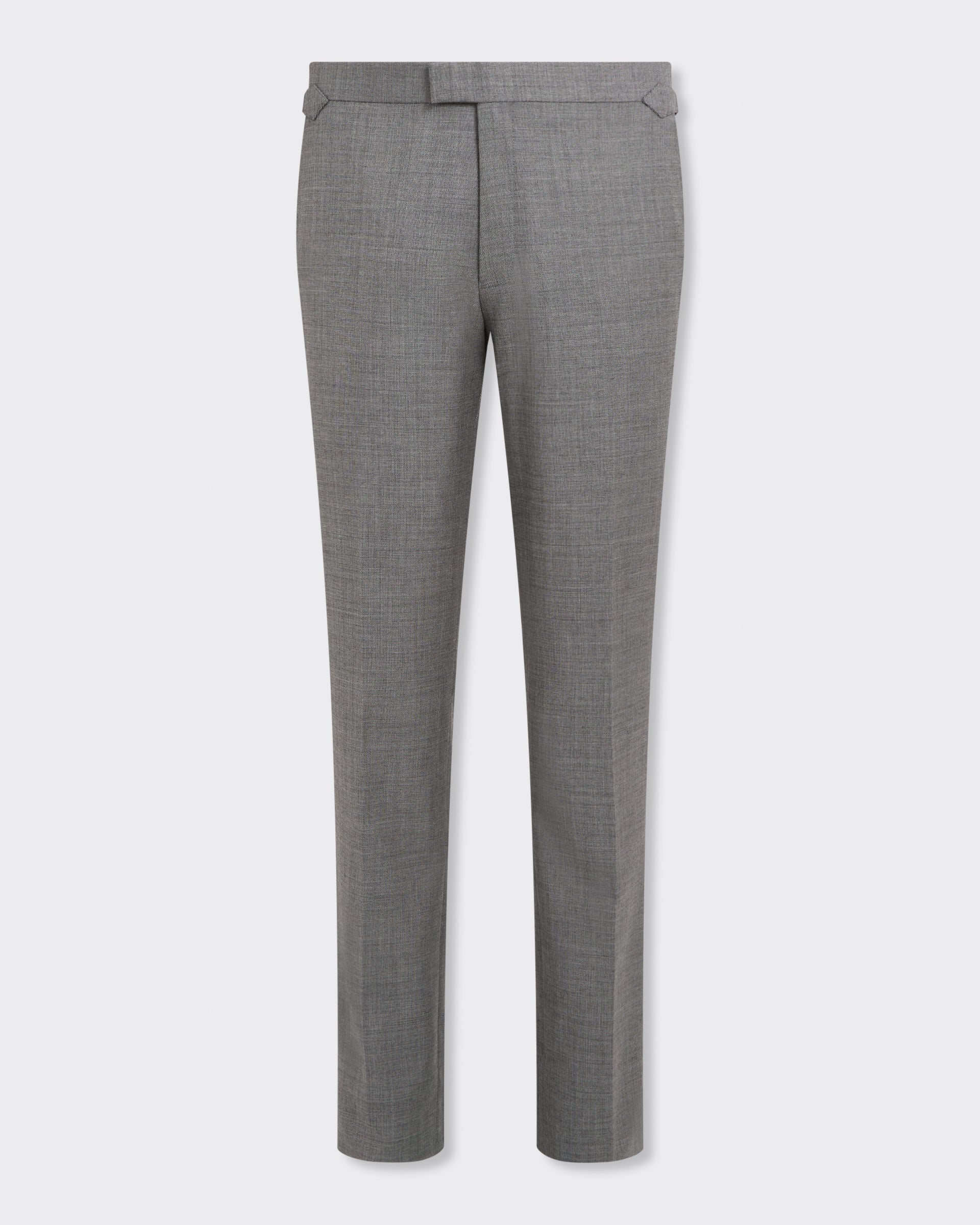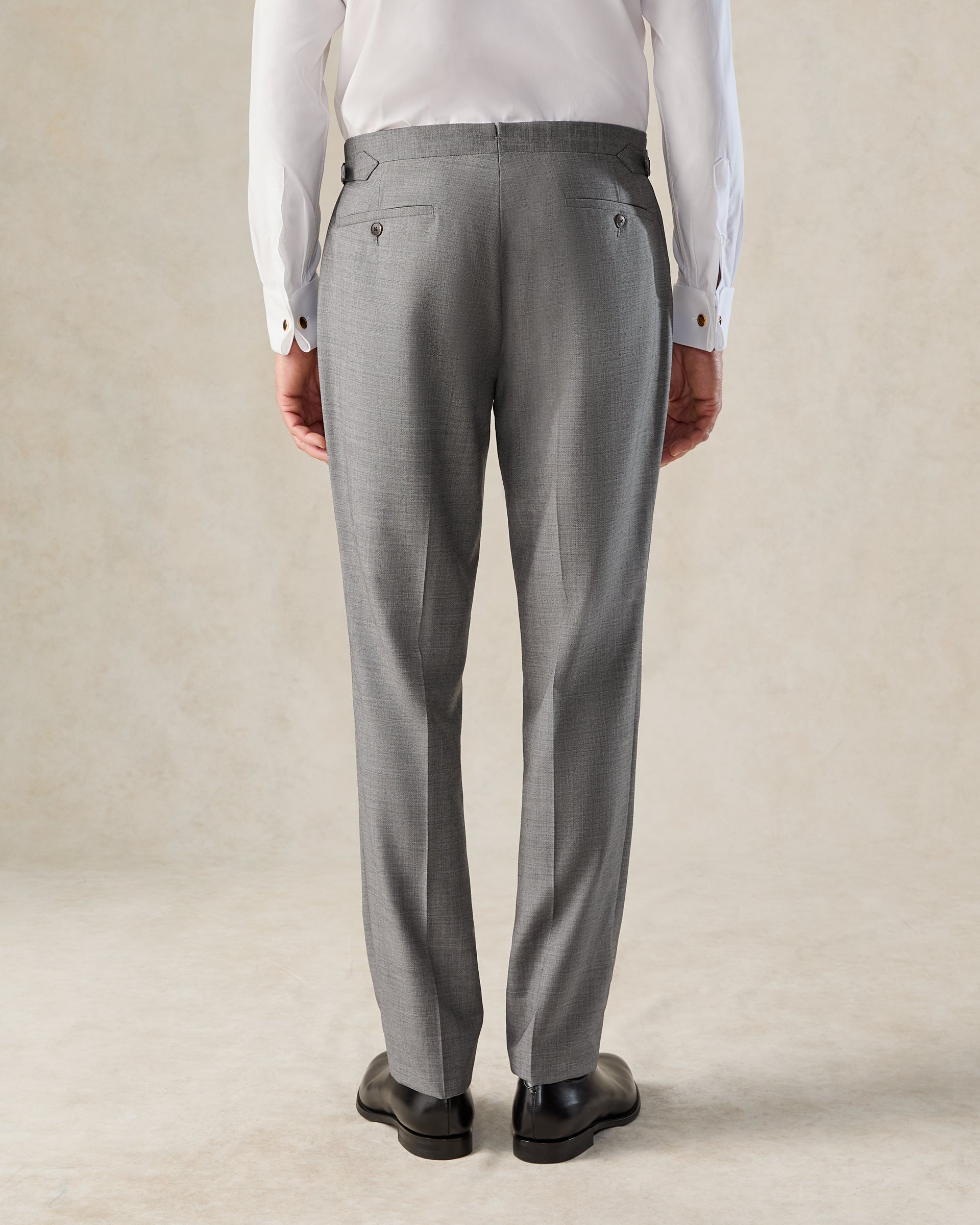 The Torlesse Morning Trouser in Grey Sharkskin by Gieves featuring a sophisticated flat front design, equipped with side adjustors and a refined dinner split for a perfect fit. The hook closure and slanted pockets with AMF stitching, half lined, while the two welt pockets with buttons at the rear add a touch of classic refinement. Crafted from luxurious Angelico fabric, these trousers are presented with an unfinished hem for tailored adjustments, they allow for a custom fit that retains a uniformly sharp profile. Part of our perennial Core range.